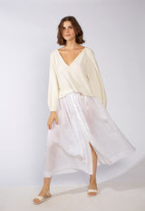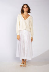Our new Sonia Skirt is crafted in our Signature Airy Cotton, featuring a button down center front with soft & tiny elasticized waist and raw edge trim down length of center front placket.