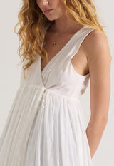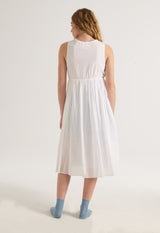 Sleeveless version of our classic relaxed fit wrap dress with a V-neck and gathered midi skirt, side seam pockets with inside ties & delicate button loop closure. Fully Lined bodice and skirt.