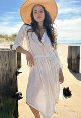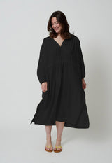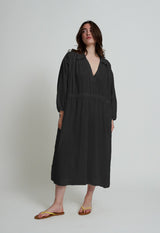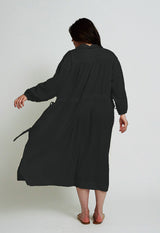 The latest edition of our oversized kaftan style dress. The Foley Dress can be worn, drawn in at the waist for a more cinched-in look or loose for an oversized silhouette. The V-neckline complements the soft collar and billowy sleeves with elastic at the wrist.
