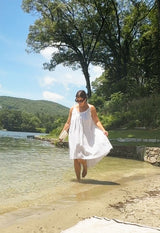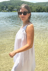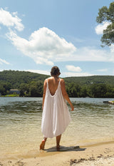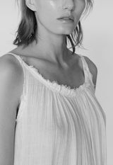Our Gathered Gauze Shortie Dress has a scooped low-cut back that cascades to a train of floating gauze in a shorter length than our Gather Maxi.