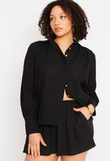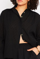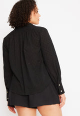 A pointed collar makes a refined statement as the fabric is gathered across the shoulders in front and back yokes and full sleeves fall down the arms into cuffed hems buttoned with small shell buttons.