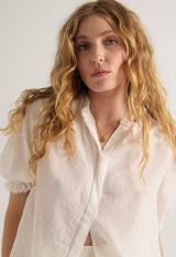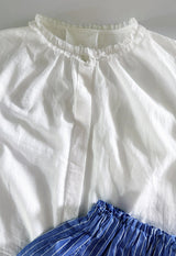 The most relaxed, short sleeved cotton blouse. Featuring tiny ruffle detail at neckline & sleeve hem with delicate pin-tuck pleats at shoulder.
